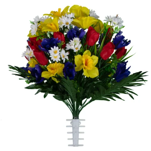 Many “decorative” faux flowers are designed for indoor displays only. This range is different. Each **artificial cemetery flower arrangement** is developed for long-term outdoor conditions:
