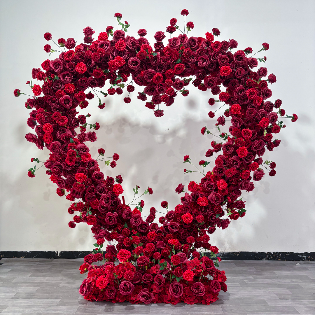 This heart-shaped artificial red rose backdrop is a freestanding display with full red rose coverage and a matching floral base. It is created for wedding planners, event rental companies, hotels, shopping malls, photo studios, and décor wholesalers who want a ready-made statement piece that looks luxurious in photos and on video. The reusable structure helps you spread the cost across many events and seasons instead of paying again and again for fresh flowers.